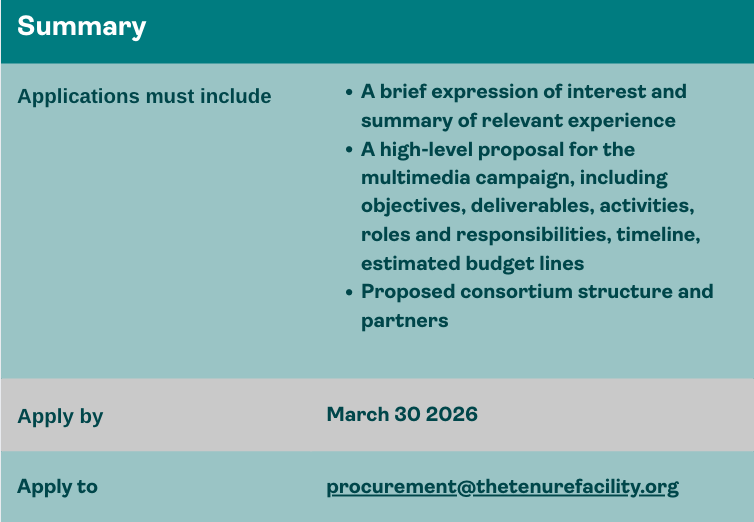Interested applicants are invited to submit their proposals within one month of the publication of this call (March 30, 2026). Proposals should be sent electronically to: procurement@thetenurefacility.org